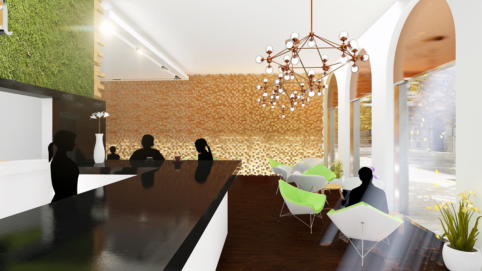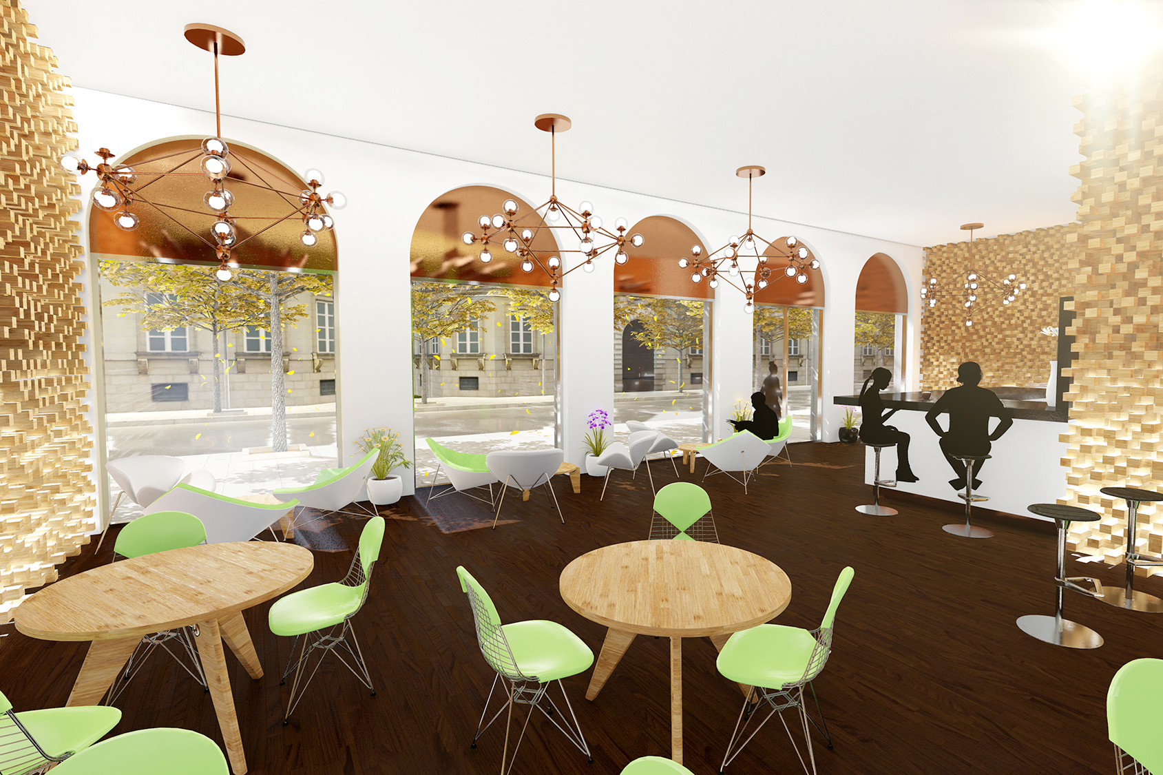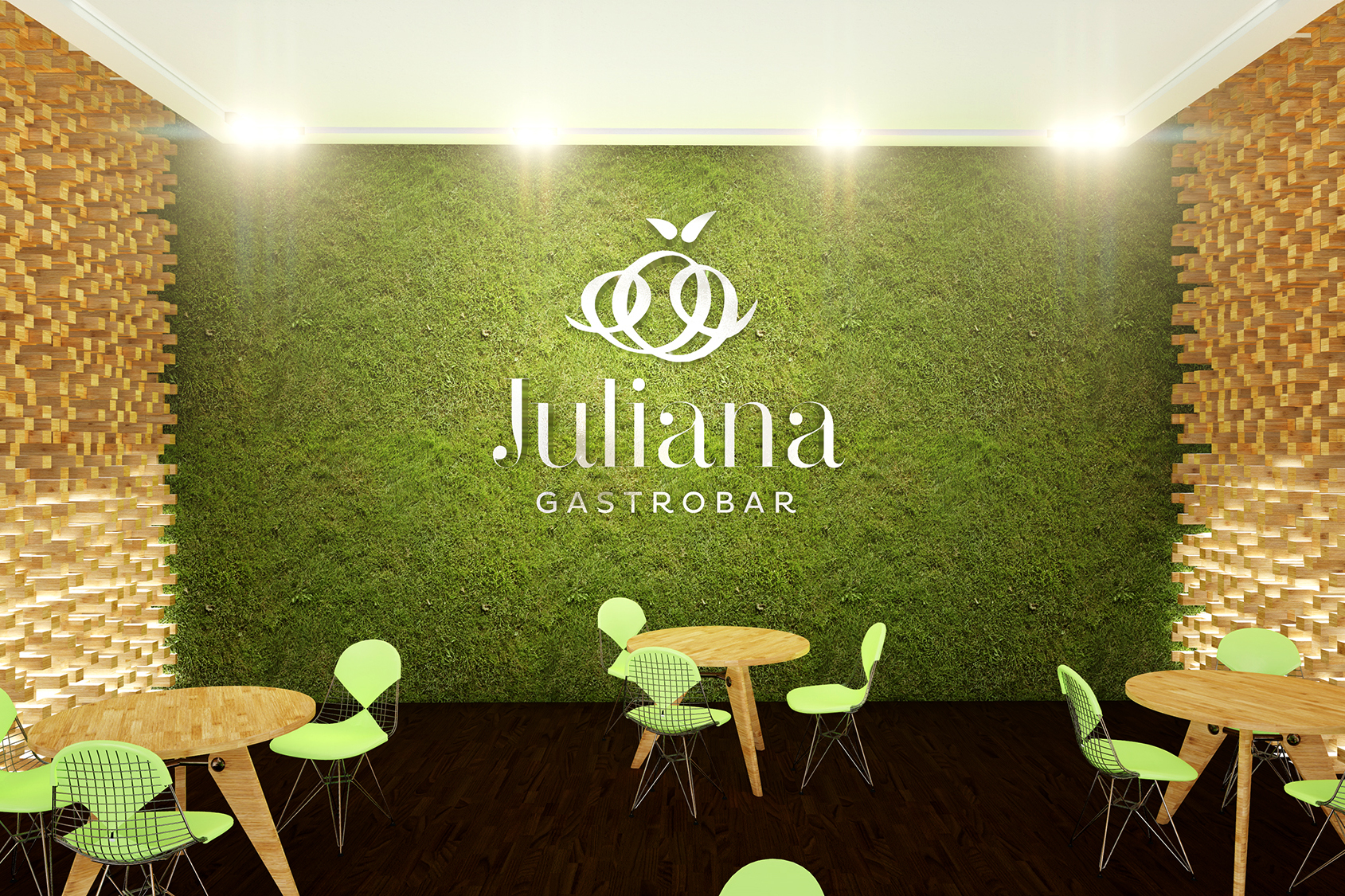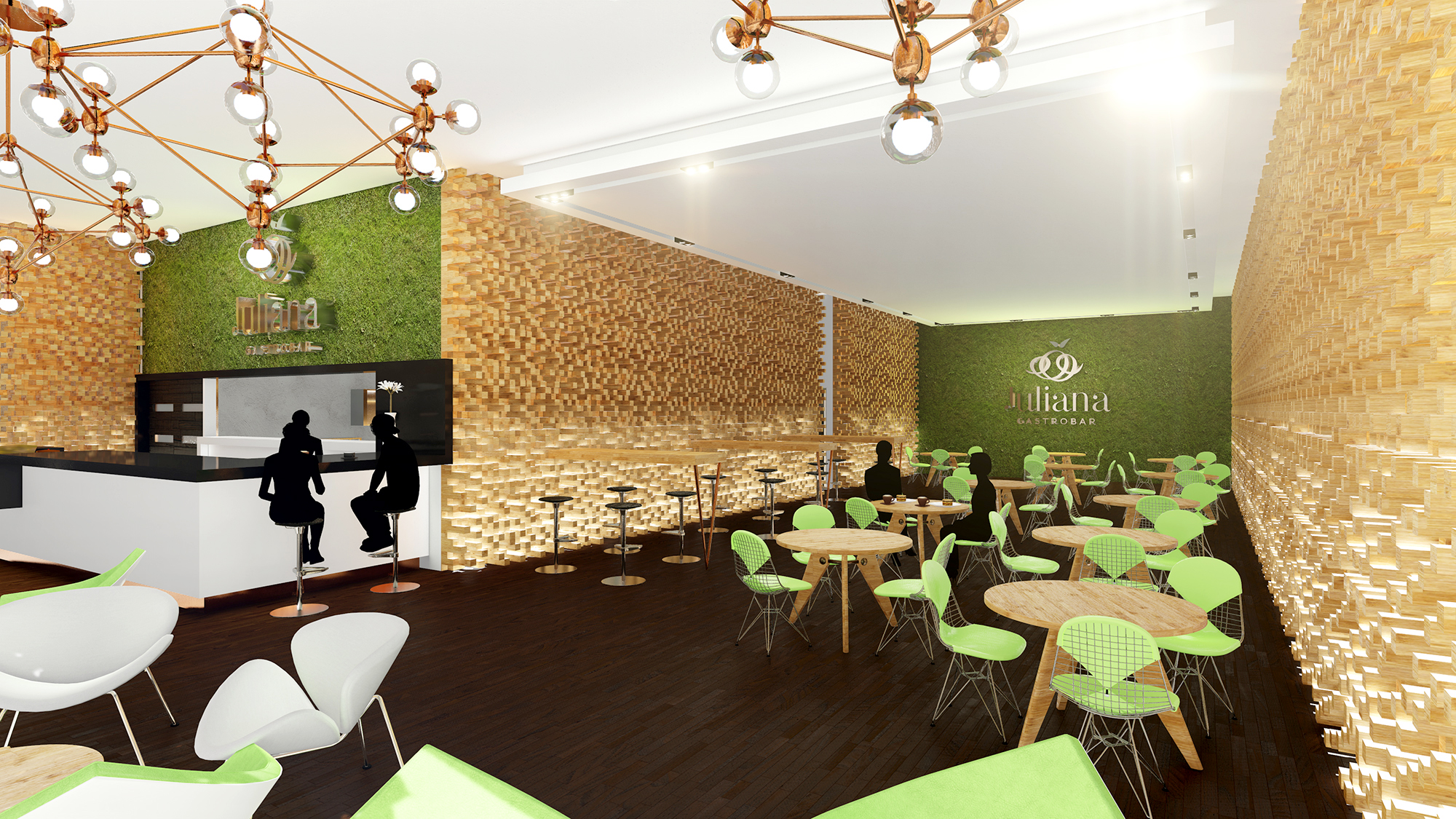 Para diseño de interiores del gastrobar se busca el contraste de la madera y la hierba, trasnmitiendose de esta manera la frescura de la marca.