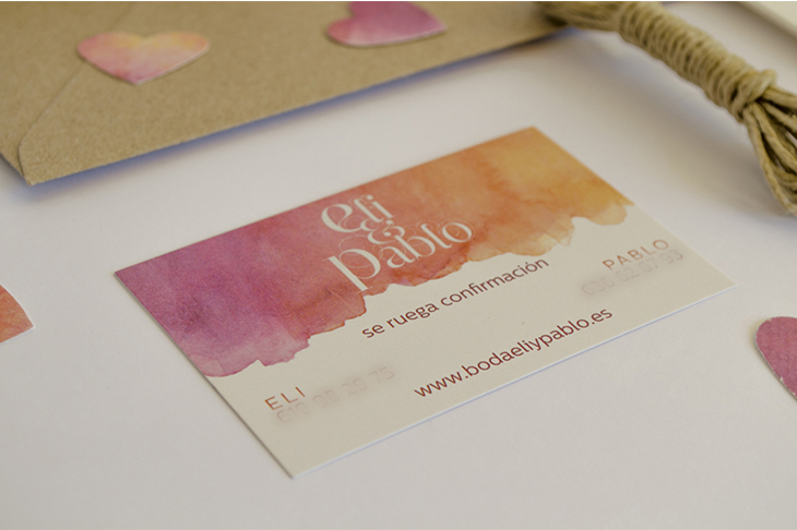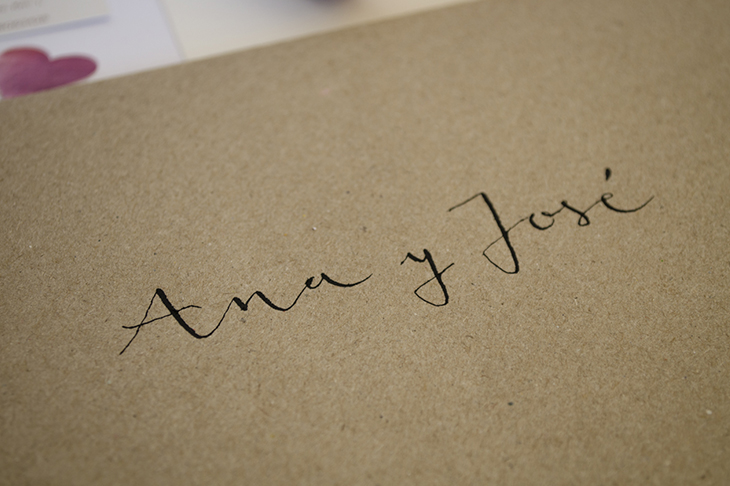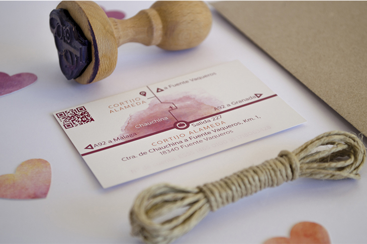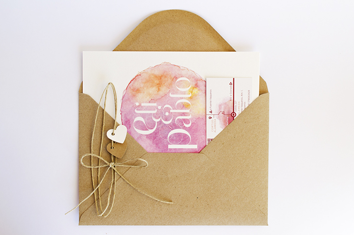 Se compone de la invitación y una tarjeta con la información de contacto de los novios y el plano con los detalles del sitio donde se celebró la boda. El sobre es de papel kraft con el sello del anagrama estampado en tinta morada, con los nombres de los invitados escritos a mano con plumilla.