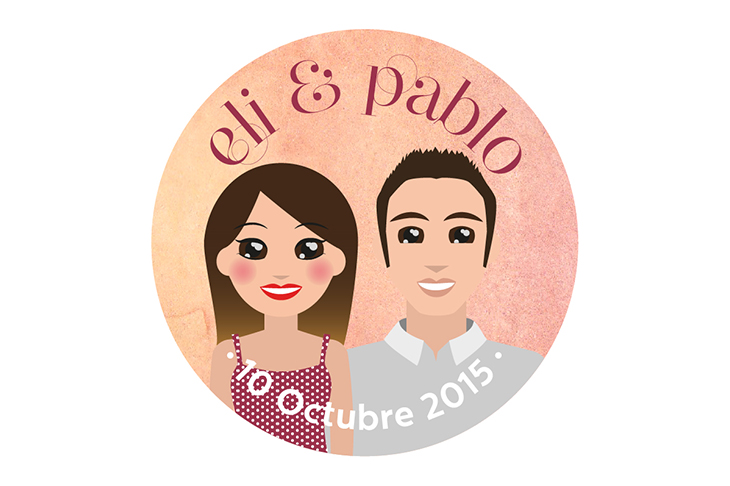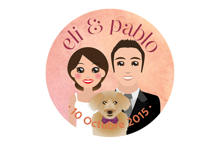 También se regalaron chapas con ilustraciones de los novios con su perrito Rocky, y del anagrama de la boda.