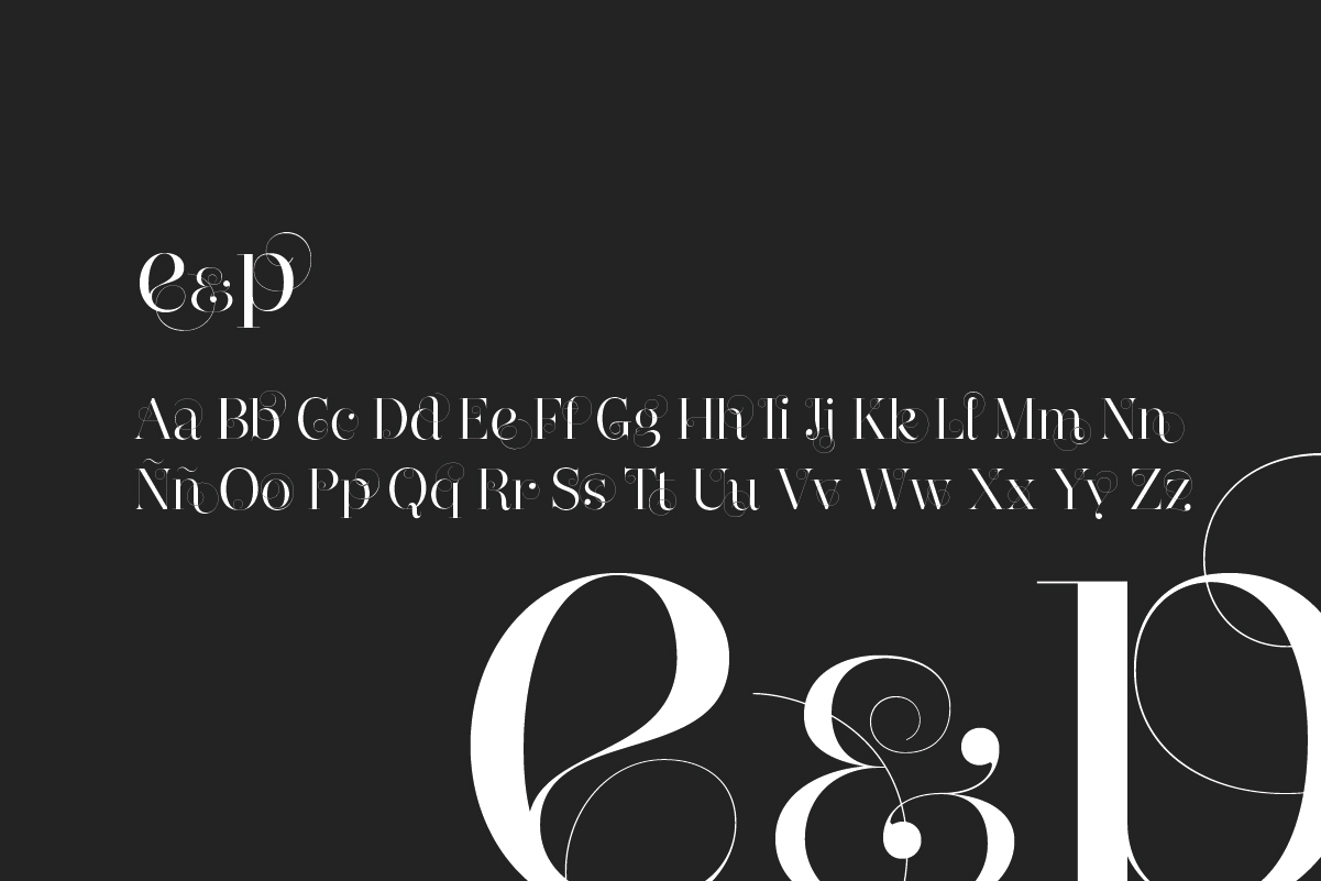 La tipografía elegida es Narziss Swirls, una didona adornada. Gracias a sus delicados remates se ha podido construir el monograma perfecto con las iniciales de los novios, que produce la sensación de estar ambas letras entrelazadas y potenciar así la idea de unión del enlace.
